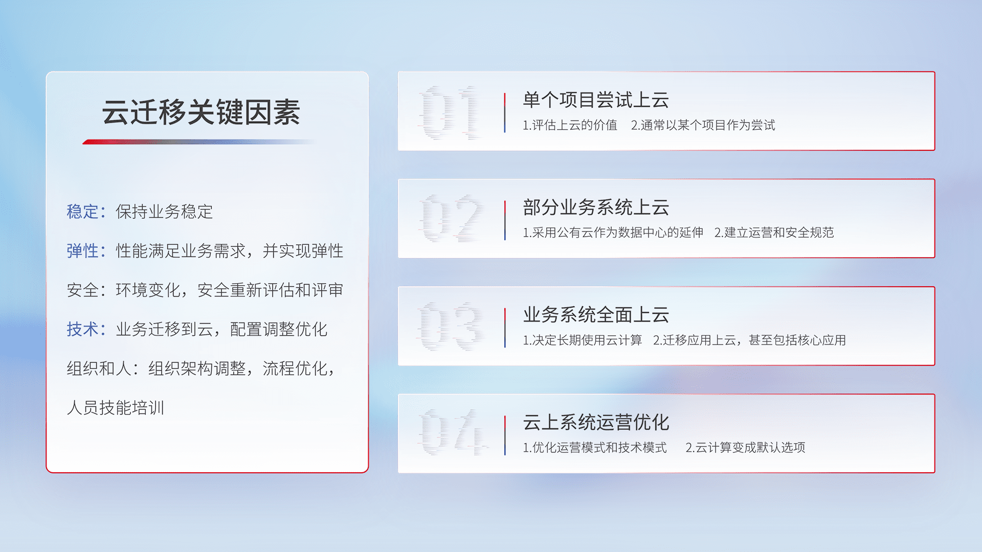 结合实际业务,,从规划设计、、云平台选型、、云原生改造、、、、数据迁移、、、、集成交付,,,,迁移全过程为客户识别最佳上云路径,,做好风险识别管理,,设计网络架构、、、、身份权限、、安全审计合规、、、、操作审计、、日志审计、、、监控告警策略、、多站点容灾设计等,,对云上基础设施进行整体规划,,,,提升IT治理水平,,以满足弹性、、、高可用、、、高性能的需求。。