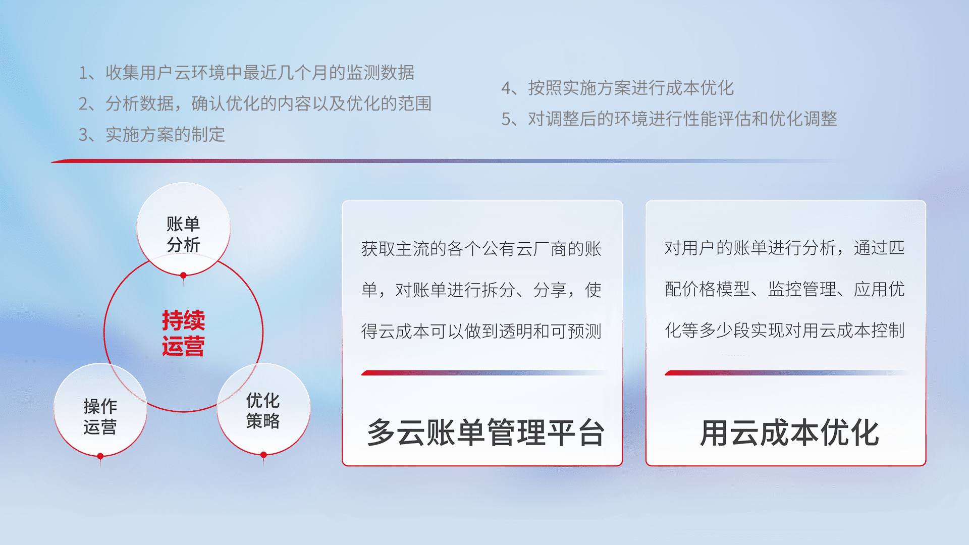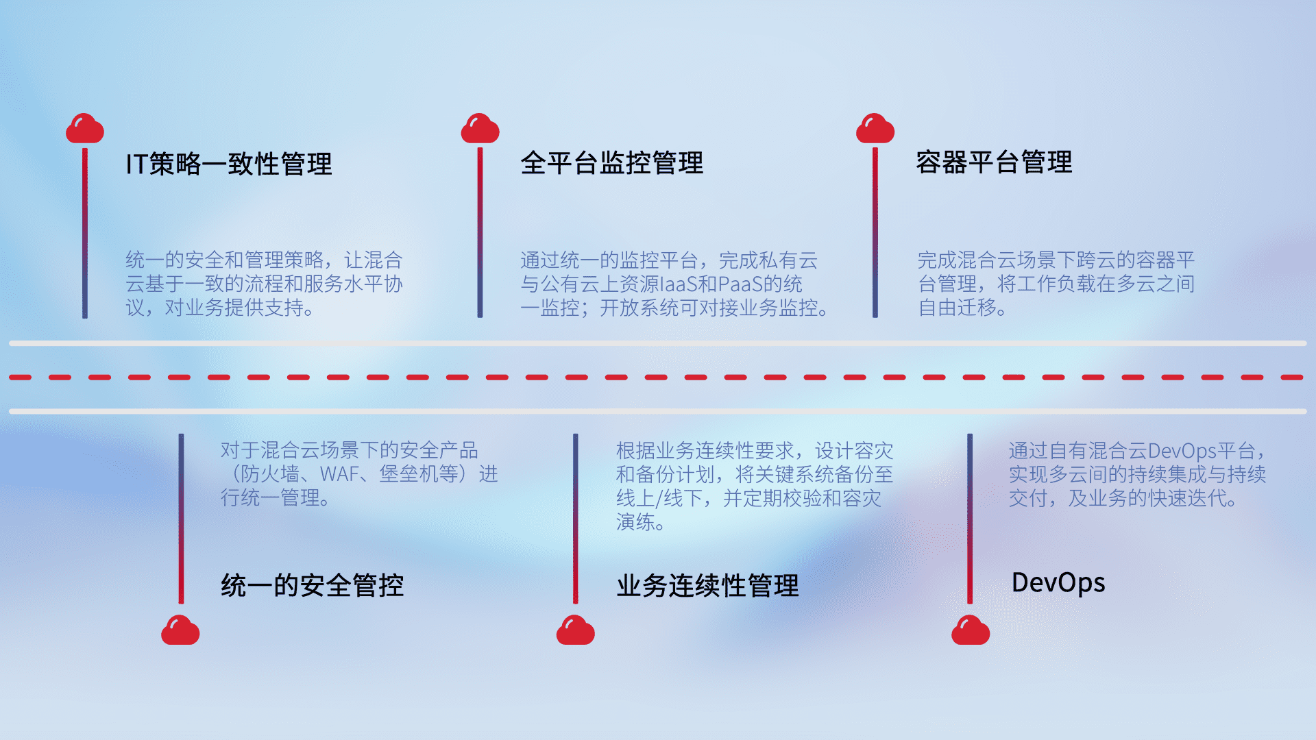 通过多云纳管,,,以统一的资源数据模型把客户的云资源进行抽象和封装,,,,进而实现对多云资源的统一操作,,,,保障云资源管理的可靠性、、、、稳定性与可用性。。。量身定制化运维内容,,配置、、、、开发运维、、、、补丁管理、、、、备份、、、监控、、认证和访问管理、、、、审计和日常巡检等,,保障在用云过程中的可靠度,,,,稳定度以及高可用率。。。。