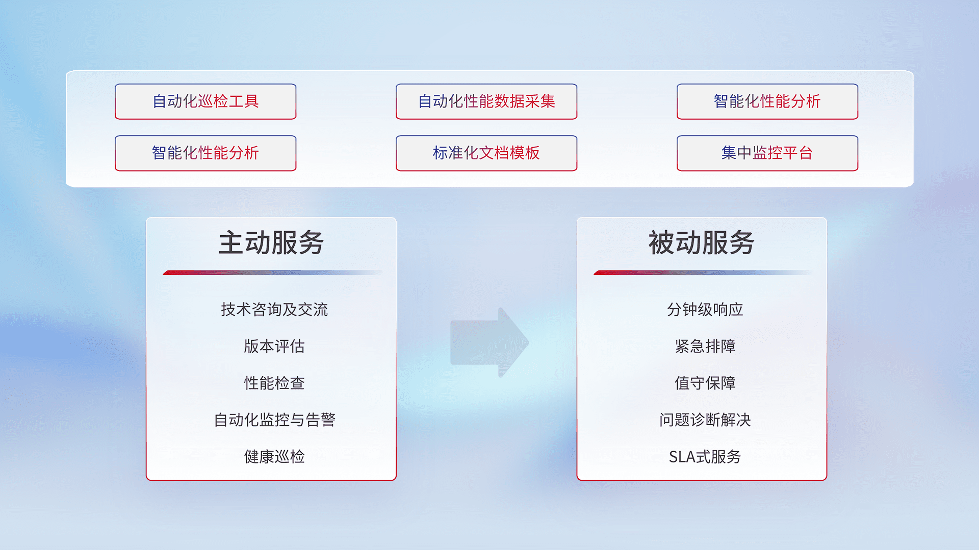 智能化工具和标准化文档,,,保障服务质量,,提供主动服务(包含技术咨询、、、版本评估、、、、性能检查、、、自动化监控与告警、、、健康巡检)和被动服务包含(分钟级响应、、、、紧急排障、、值守保障、、、问题诊断解决、、、、SLA服务)。。。